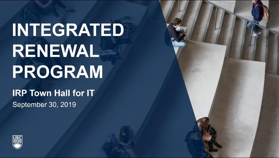 The archived livestream from the recent IRP Town Hall for the IT community is now available for those unable to attend the September 30 event. With more than 300 IT professionals in attendance, the Town Hall was organized by the Integrated Renewal Program (IRP) to hear more about the impact of the program and its impact to IT Services to the campus. Answers from the Q and A have also been transcribed and are available for viewing. Please note that you will need Campus-Wide Login to access the materials. For more information on how the IRP will transform UBC’s systems and processes to improve collaboration and innovation, please visit the IRP website.