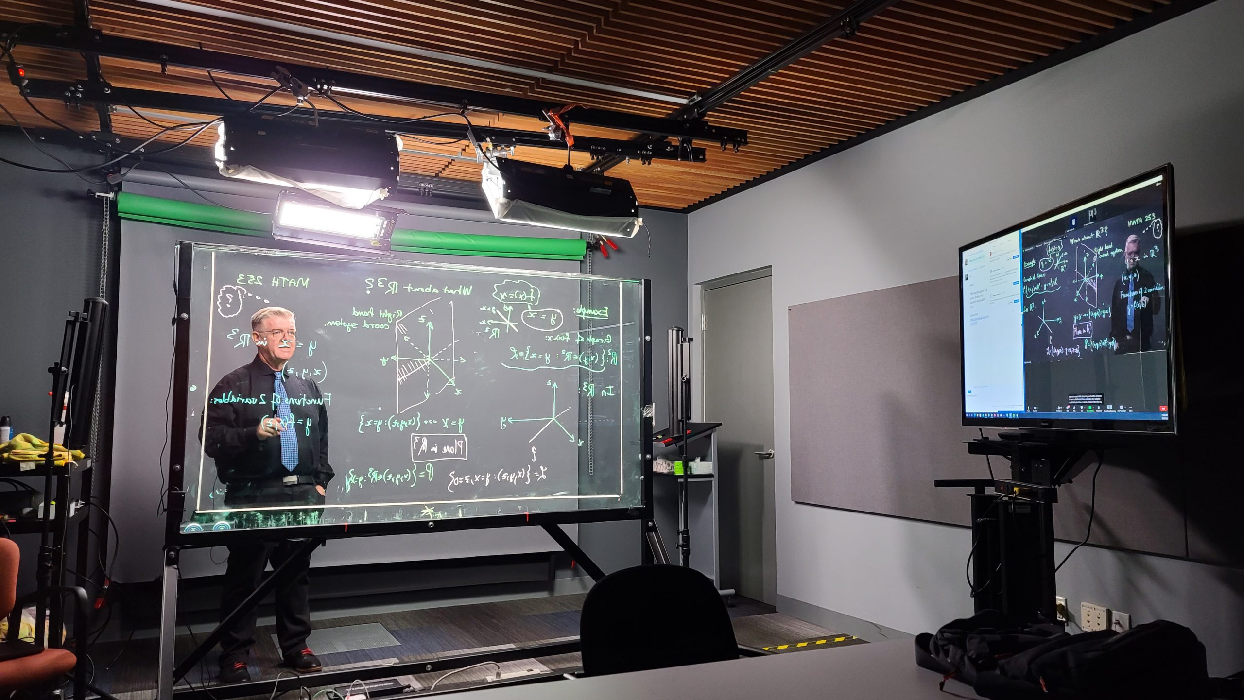 Two courses this semester, Math 253 – Multivariable Calculus, and Math 100 Flavour A – Differential Calculus with Applications, will be livestreamed from the lightboard at UBC Studios. The total enrollment numbers for the two sections total over 1000 individuals, setting an exciting record for the lightboard.