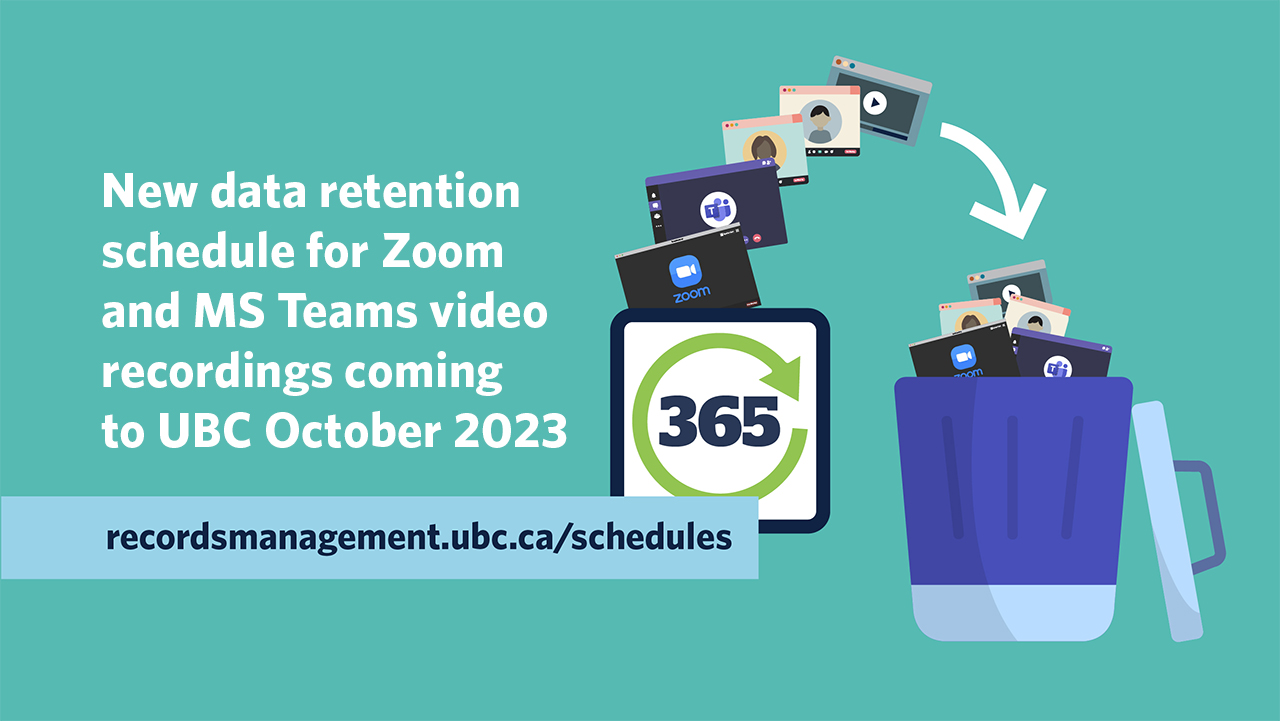 In October 2023, UBC will implement an automated one-year retention policy for video recordings. This data retention schedule will affect all faculty, staff and student employees at both UBC Vancouver and UBC Okanagan campuses. This new policy is issued by UBC’s Records Management Office.