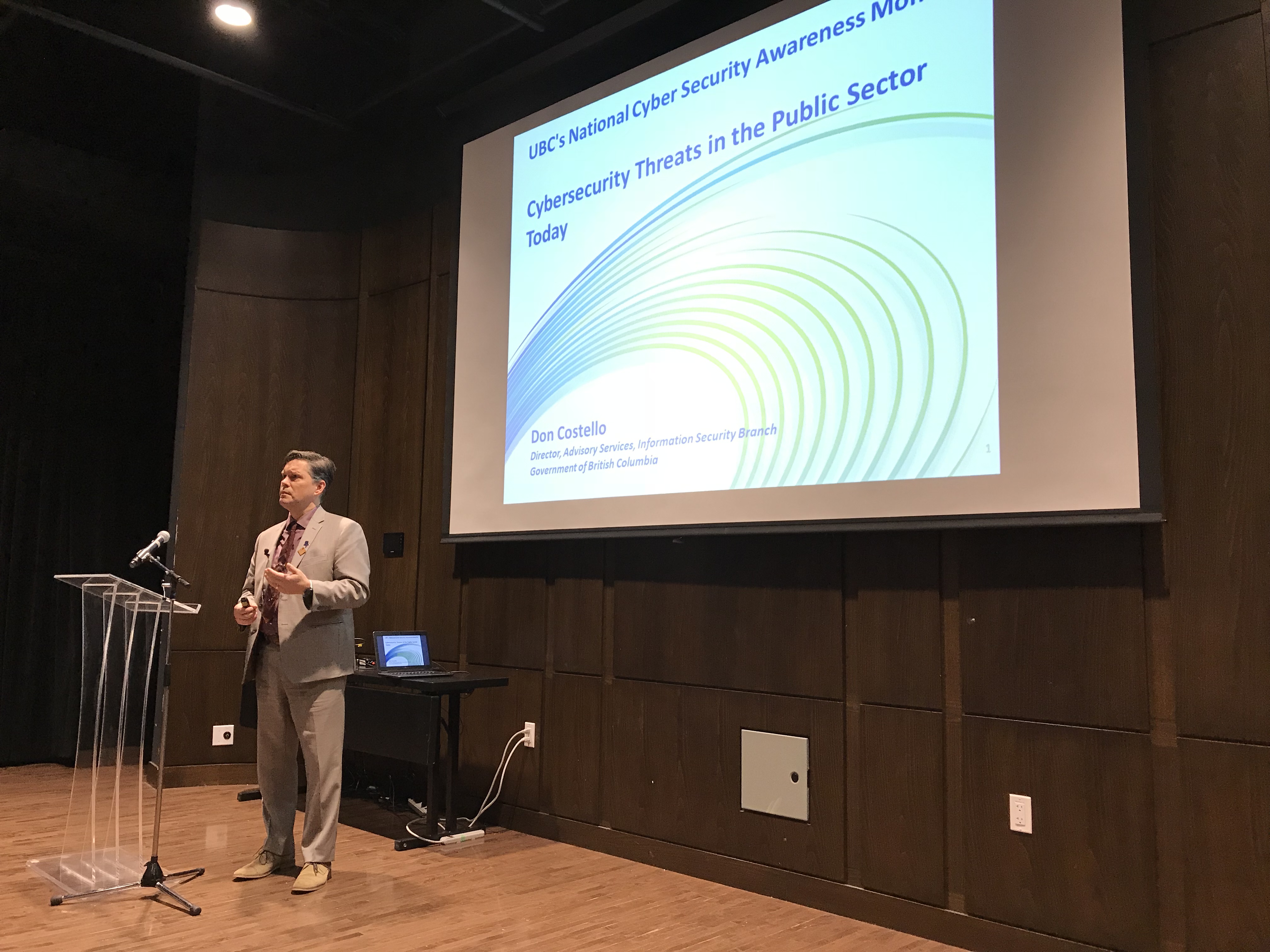 October is Cybersecurity Awareness Month and on October 18, 2018, UBC IT's Cybersecurity Team hosted the inagural UBC Cybersecurity Summit event. Guest speaker Don Costello from the BC Government's Office of the CIO Information Security Branch spoke to more than 100 attendees about how to stay safe both at home and at work, followed by an open house to meet the members of our own cybersecurity team at UBC, and the technologies they are using to keep the univeresity safe.