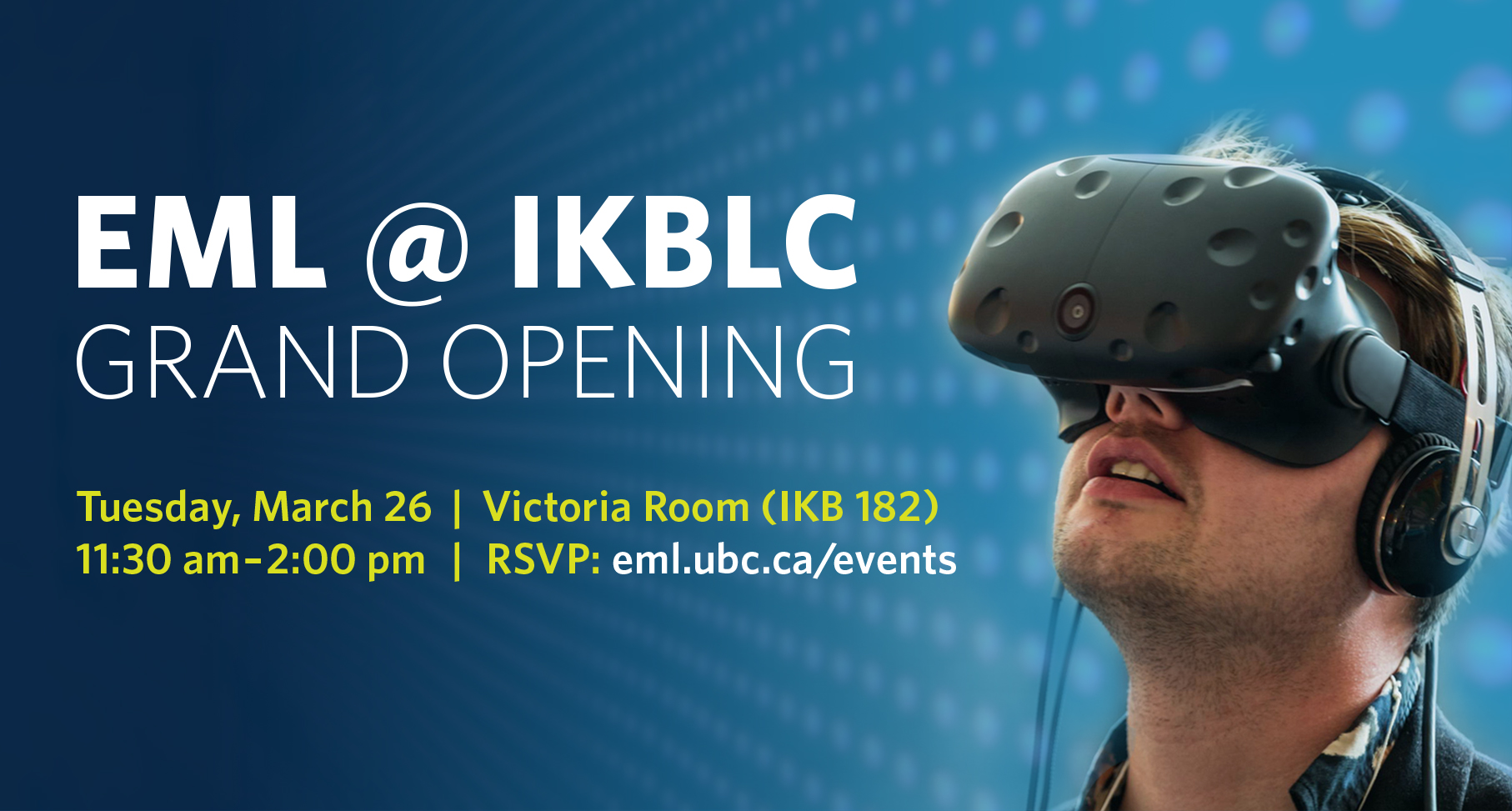 Emerging Media Lab has opened a new space at the Irving K. Baber Learning Centre. On March 26, 2019, join the team in celebrating their new location in Room 183 on the first floor of IKBLC. There will be a panel discussion featuring four faculty members that use emerging technologies to enhance their teaching and students’ education for the first part of the event and an open house in the latter half of the day for the community to take a look at the space and to check out the projects that the team has been working on this term.