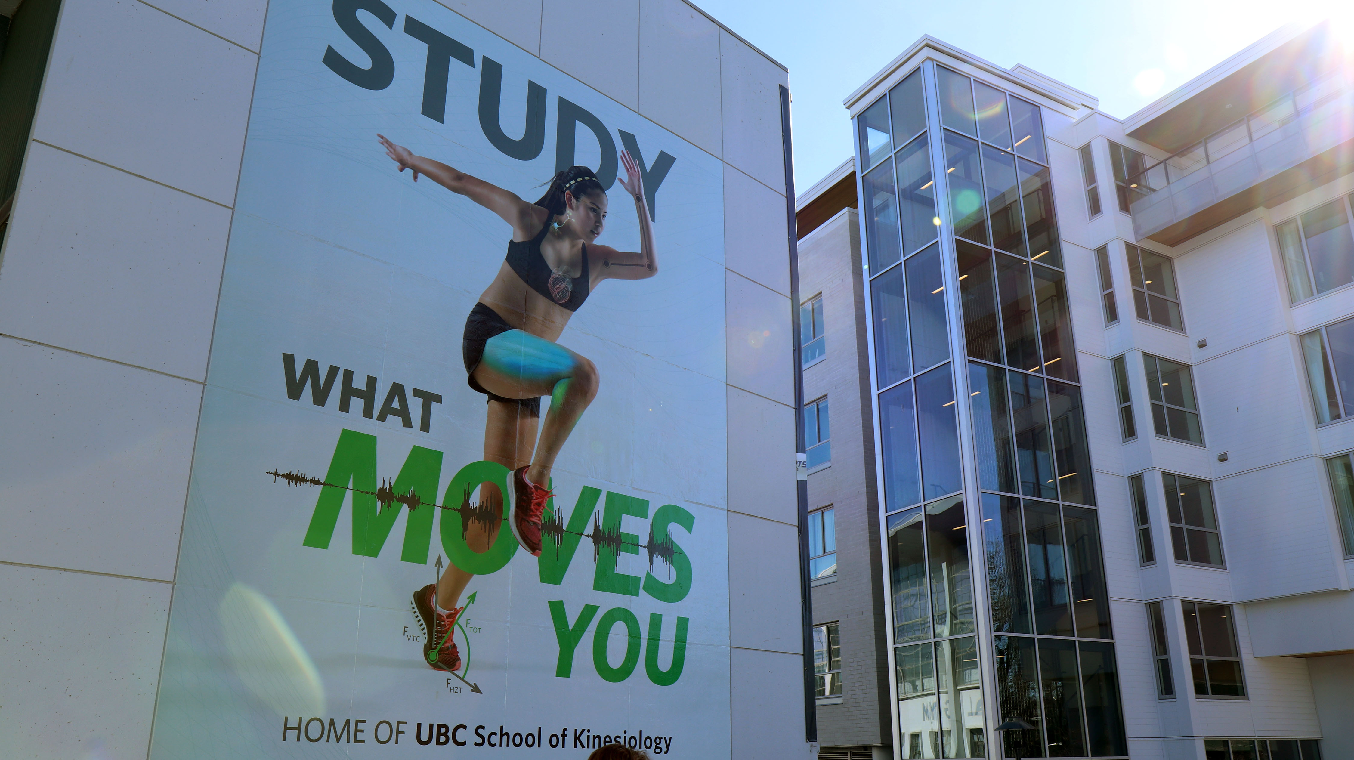 This 15x20 feet banner image represents elements of the field of kinesiology, with anatomical, physiological and biomechanical design features superimposed on the photograph of Musqueam athlete, Scarlett Sparrow-Felix. The banner symbolizes the future and the recognition of history, people and place, and the important role the School of Kinesiology, and Athletics and Recreation play in the evolution of the university.