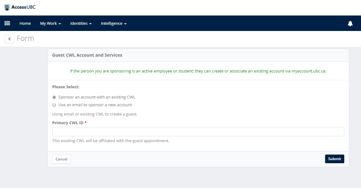 If the guest has an existing CWL, enter it into the 'Primary CWL ID' field and select Submit.