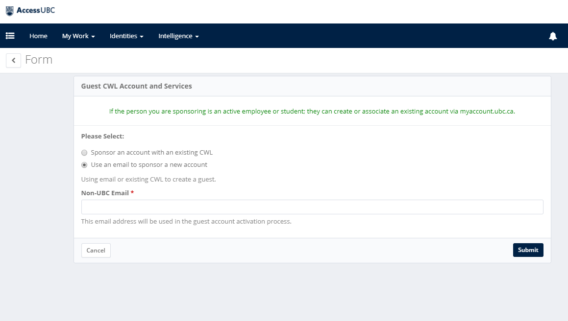 If the guest does not have an existing CWL, enter their non-UBC email into the specified field and select Submit.