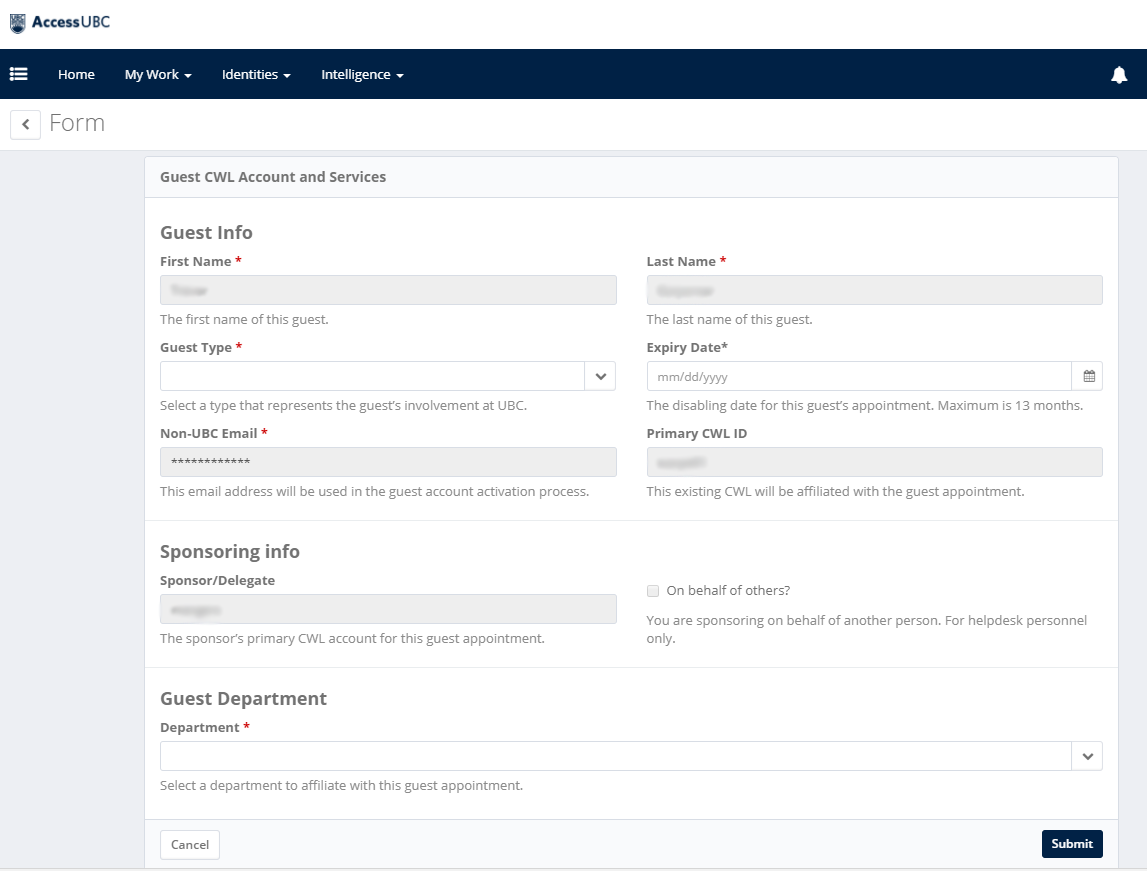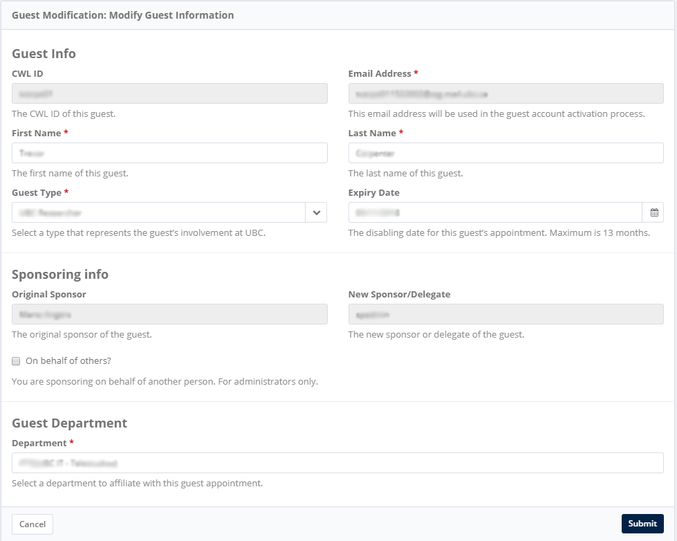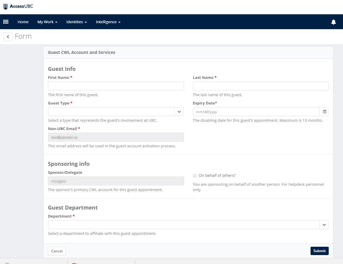 To sponsor a guest with special circumstances (for another department or on behalf of someone else), contact the UBC IT Helpdesk for assistance.