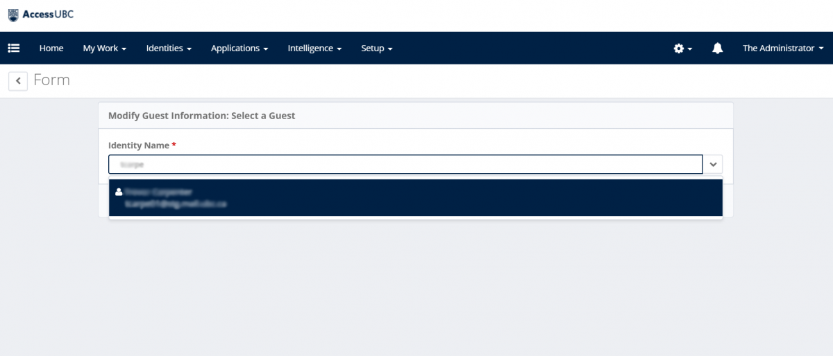 - After selecting 'Modify a Guest Account' from the AccessUBC Home Page, a user will be presented with a blank field where they can enter the guest identity they wish to modify.