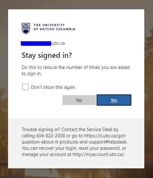 - You will be prompted to stay signed in to all your apps with your UBC account on your device. If you would like to, check Allow my organization to manage my device and click OK. This setting is to trust the device (laptop/mobile) registered in the server. If you log in from the same device in the future, it will not prompt you for your credentials.