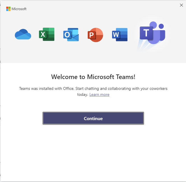 After you have installed MS Teams, the following window will pop-up. Click Continue.