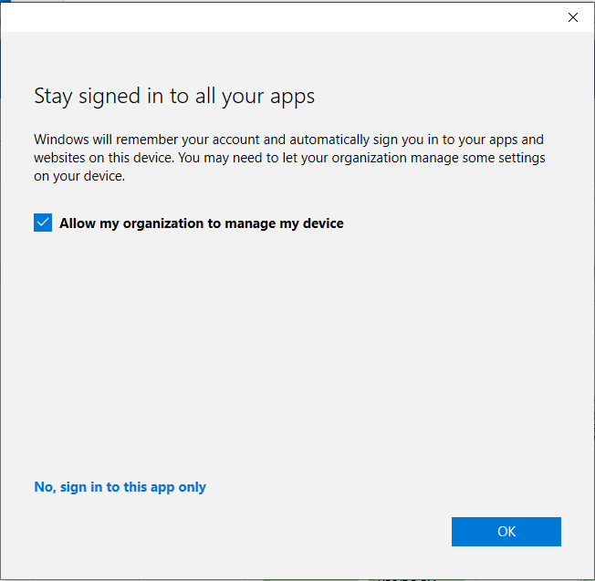 - If you are using a temporary device, you may uncheck the option for allow my organization to manage my device. Click No, sign in to this app only at the bottom afterwards.