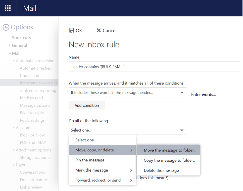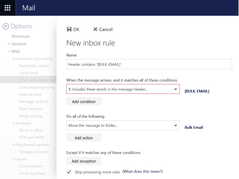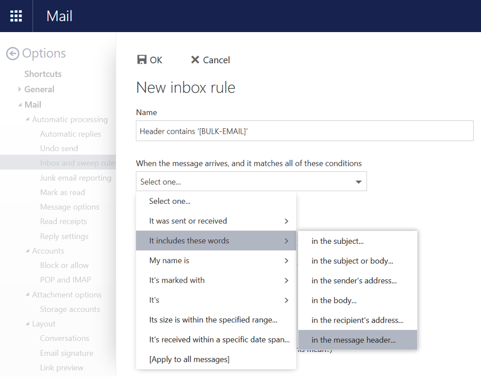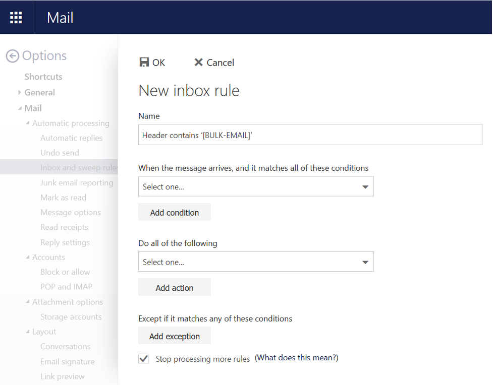 - Create a name for the rule (it can be useful to create a very specific name for the email rule as below, e.g. Header contains ‘[BULK-EMAIL]’)