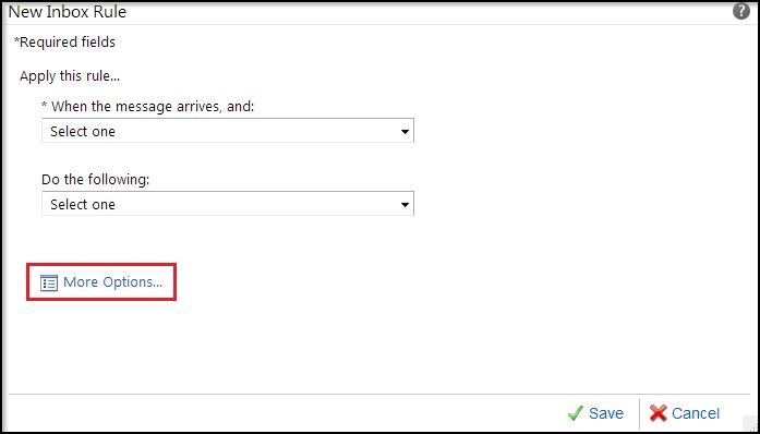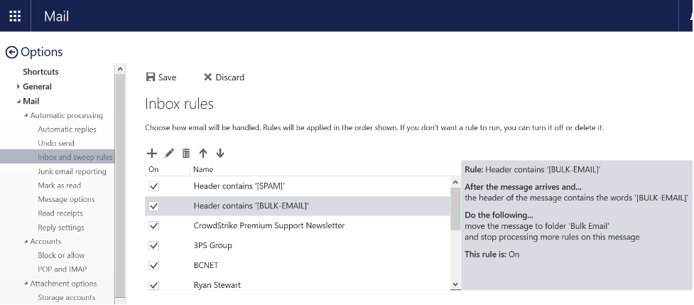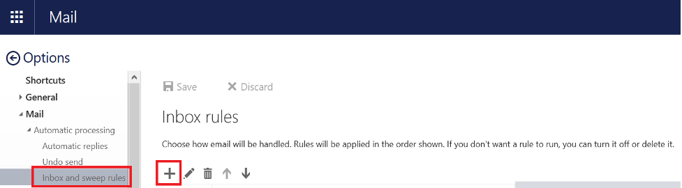- On the “Options” screen, select “Inbox and sweep rules”, then click the “+” symbol to add a new inbox rule.