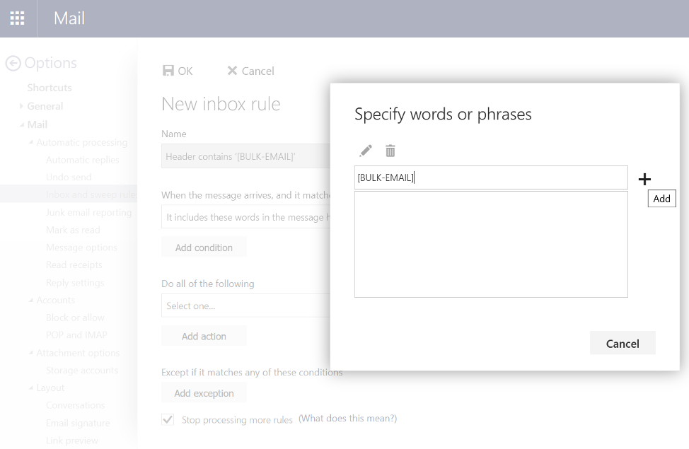 - In the text field under "Specify Words or Phrases", type in: [BULK-EMAIL]