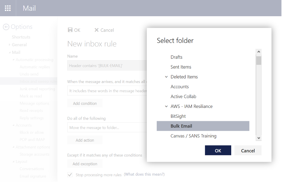 - You have now set up a server-side rule to move suspected bulk email messages into your "Bulk Email" folder. Please regularly check this folder to ensure that there are no false positives that appear in it. Please note that this will not filter out all bulk email messages but it should reduce the amount that you receive in your Inbox.