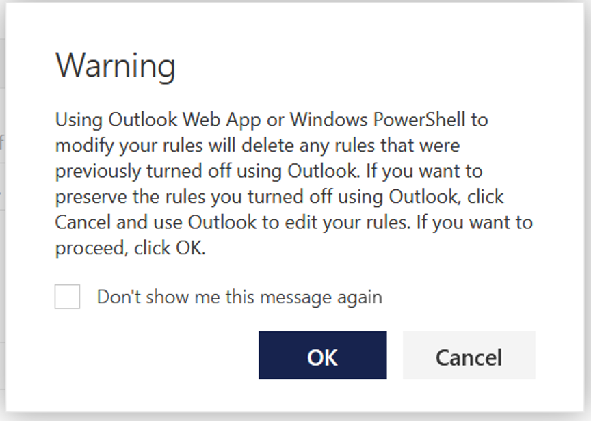- You may receive a warning after clicking the "Save" button. This warning will only appear if you had previously set up any rules in the Outlook email client and you have turned them off. If you click "Yes" to the warning message, it will remove any disabled Outlook client-side rules that you had previously set up. Since they are turned off, there is no real impact to you other than you may have a recreate that rule if you need it again in the future. You must click "Yes" to complete the setup of this bulk email filtering rule. However, for the majority of people, this alert will not appear.