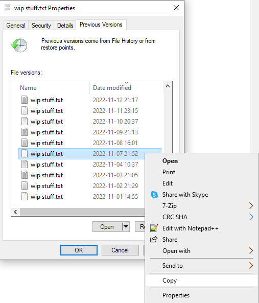 - To save a copy of the older version in another location rather than overwrite your existing version, select it and click Copy